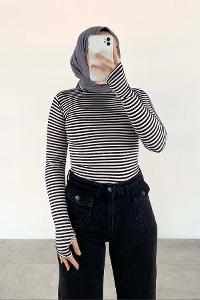 Lamelif Bisiklet Yaka Zebra Desenli Body Siyah Beyaz