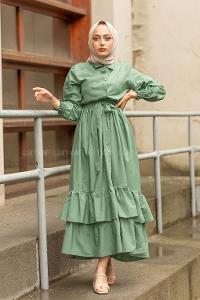 Lamelif Ön Yarım Düğme Detaylı Müslin Kumaş Tesettür Elbise Açık Yeşil