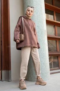 Lamelif Etek Ucu Bağcıklı Kanguru Cep Sweatshirt Acı Kahve