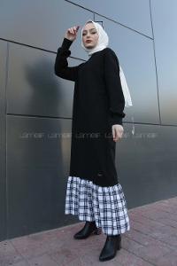 Lamelif Çizgi Detaylı Garnili Tesettür Elbise Siyah