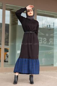 Modalamelif Etek Ucu Ekose Detaylı Elbise Siyah Saks Mavisi
