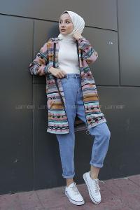 -Etnik Desen Kapşonlu Tam Fermuarlı Polar