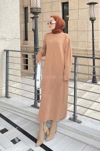Lamelif Fitilli Triko Uzun Tesettür Elbise Sütlü Kahve