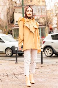 Modalamelif Fularlı Yaka Gipeli Gömlek Tunik Sütlü Kahve