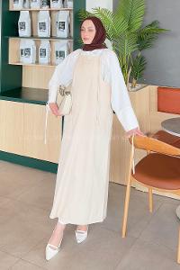 Lamelif Kanguru Cepli Tesettür Elbise Krem