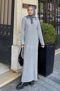 Lamelif Gömlek Yaka Düğme Detaylı Fitilli Triko Tesettür Elbise Gri