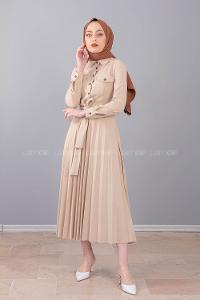Modalamelif Gömlek Yaka Eteği Piliseli Elbise Bej