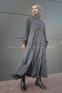 Modalamelif Hakim Yaka Önü Yarım Düğmeli Elbise Füme