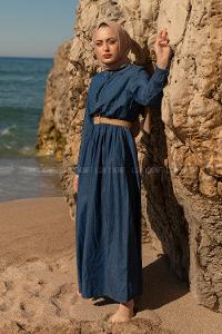 Modalamelif Hasır Kemerli Denim elbise Koyu Mavi