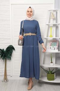 Lamelif Ön Yarım Düğme Detaylı Müslin Kumaş Tesettür Elbise Gri