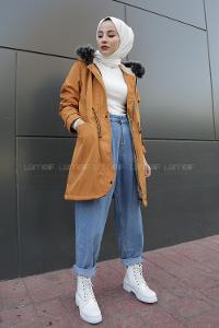Modalamelif İçi Kürklü Kapşonlu Bondit Mont Hardal Sarısı