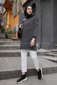 Modalamelif İnce Beyaz Çizgili Tunik Siyah