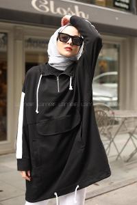 Lamelif Kapşonlu Oversize Yan Cepli Sweat Siyah