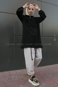 Lamelif Kapüşon Yaka Cepli Sweatshirt Siyah