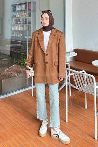 Lamelif Dekoratif Cep Detaylı Tesettür Ceket Acı Kahve
