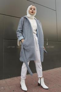 Modalamelif Kapşonlu Belden Bağlamalı Bergamo Kaban Açık Mavi