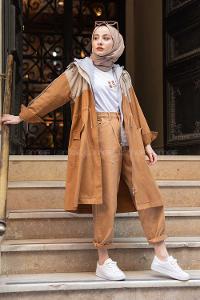 Modalamelif Kapşonlu Garnili Trenç Taba