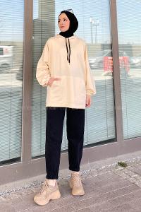 Lamelif Kapşonlu Oversize Yan Cepli Sweat Krem