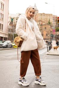 Lamelif Biye Detaylı Tedy Peluş Mont Sütlü Kahve