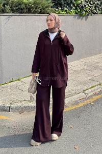 Lamelif Kapüşonlu Kanguru Cep İkili Takım Mürdüm
