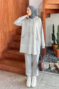 Lamelif Kapüşonlu Oysho Tesettür Takım Gri