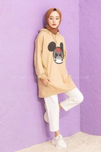 Lamelif Kapşonlu Oversize Yan Cepli Sweat Camel