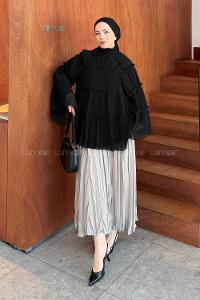 Lamelif Kat Kat Fırfırlı Şifon Tesettür Tunik Siyah