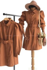 kalın kemerli, karpuz kol detaylı, klasik gömlek yaka, şık tunik.