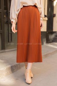 Lamelif Önü Pileli Scuba Kumaş Etek Kahverengi