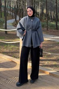 Lamelif Hakim Yaka Kemer Detaylı Kaşe Panço Gri