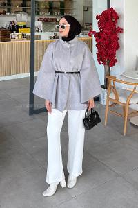 Lamelif Hakim Yaka Kemer Detaylı Kaşe Panço Gri