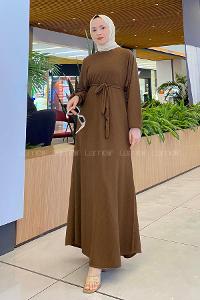 Lamelif Bel Büzgülü Tesettür Elbise Acı Kahve