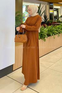 Lamelif Balon Kol Katlı Tesettür Elbise Acı Kahve