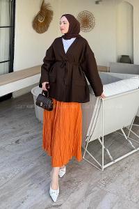 Lamelif Kemerli Tesettür Ceket Kahverengi