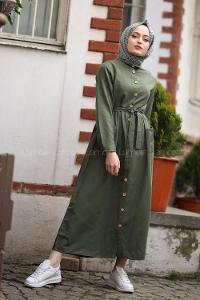 Gömlek yaka ve uzun kollu elbise. Düğme detaylı ve beli kemerli, yanlardan yama cepli, tahta düğme iliklemeli ve uyumlu renkte kumaşlı bağlanabilir kemerli.