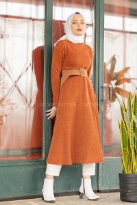 Modalamelif Kloş Kemerli Triko Elbise Kiremit