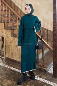 Lamelif Kol-Etek Ucu Nakışlı Triko Tesettür Elbise Zümrüt