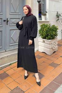 Lamelif Balon Kol Kemerli Tesettür Elbise Siyah