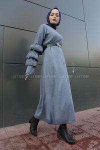 Lamelif Balon Kol Katlı Tesettür Elbise Saks Mavisi