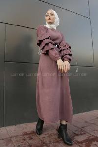 Modalamelif Kolları Fırfırlı Triko Elbise Gül Kurusu