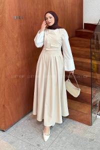 Lamelif Balon Kol Bağlamalı Tesettür Elbise Kum Beji