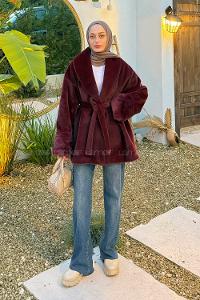 Lamelif Kol Kürk Detaylı Kaban Bordo