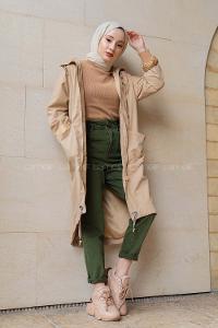 Modalamelif Kuşak Bağlama Detaylı Kaşe Kaban Bej