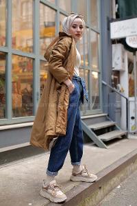 kuş gözlü, içi astarlı, boydan fermuarlı, çift cepli, yakası ve etek ucu ayarlanabilir büzgülü, uzun mevsimlik kaban.