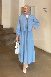 Lamelif Kimonolu Kot Tesettür Takım Buz Mavisi