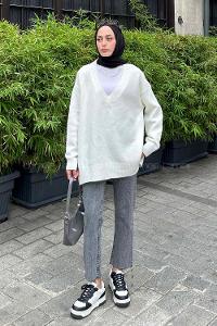 Lamelif Massimo V yaka Triko Kazak Beyaz
