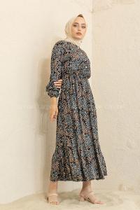 Modalamelif Mini Yaprak Desenli Elbise Siyah Turkuaz