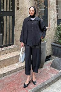 Lamelif Modal Kumaş Gömlek Pantolon İkili Tesettür Takım Siyah