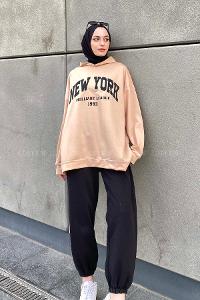 Lamelif Newyork Baskı Detaylı Kapüşonlu Sweatshirt Sütlükahve