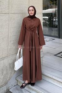 Lamelif Ön Yarım Düğme Detaylı Müslin Kumaş Tesettür Elbise Kahverengi